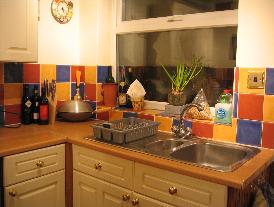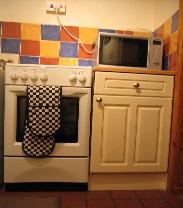 A fully functional kitchen with electric fan assisted oven with electric hot plates, microwave and a full compliment of pots, pans and utensils.